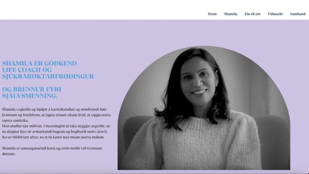 Hey, eg eri Shamila. Eg eri sjúkrarøktarfrøðingur og útbúgvin, viðurkend ‘Covenant Life Coach’ (Lívs Venjari), við brennandi ynskinum um at síggja kvinnur í øllum aldri mennast á lívsferðini.